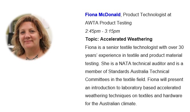 AWTA Product Testing are presenting at the Business Session tomorrow – why not come and learn more about Accelerated Weathering!