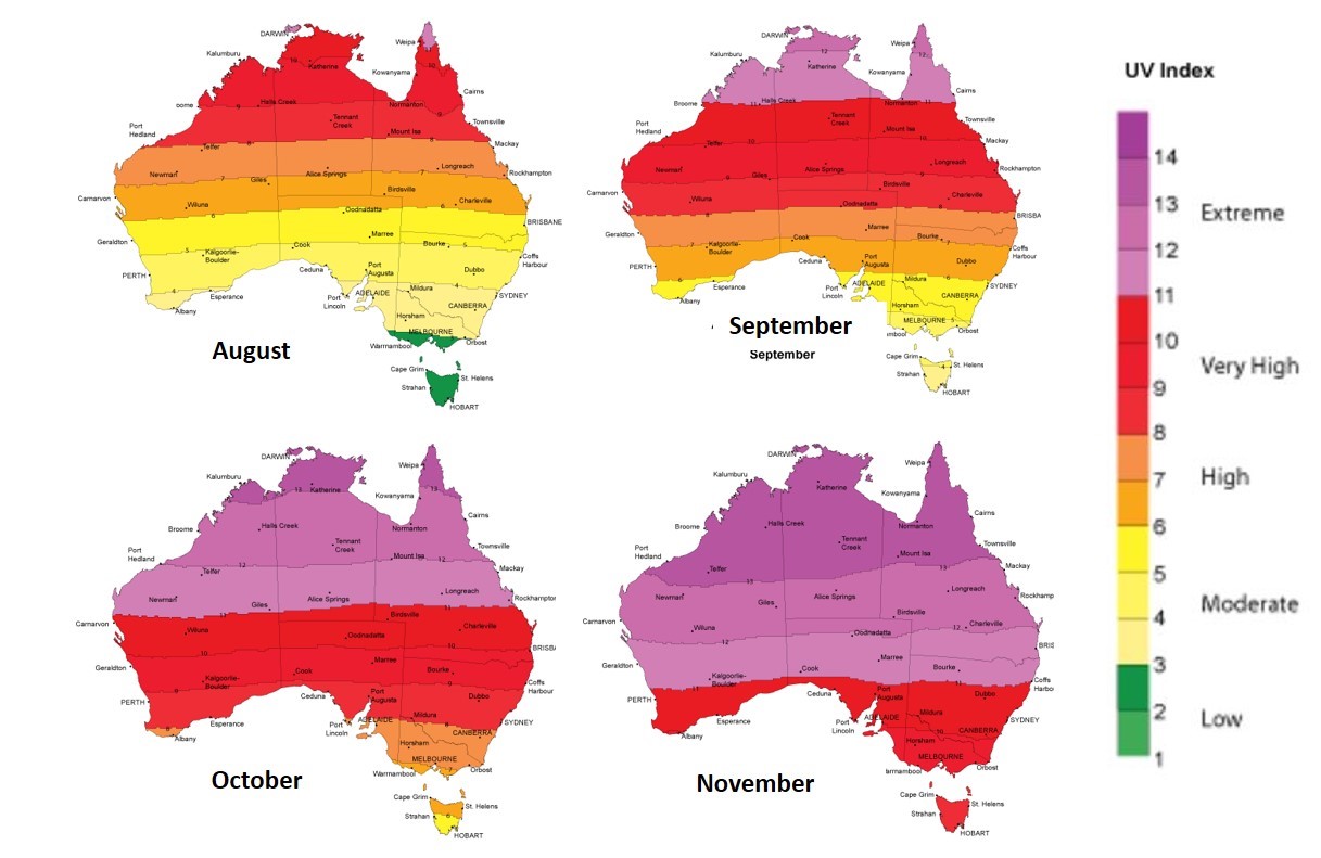 It is important to note that there is no “foolproof” test that will provide an accurate prediction of service performance and life expectancy or that will accommodate the wide range of climatic conditions experienced geographically. As can be seen in the image below, just in Australia alone the UV levels vary between states and throughout the year.